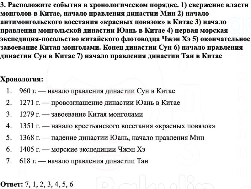 3. Расположите события в хронологическом порядке. 1) свержение власти монголов в Китае, начало правления династии Мин 2) начало антимонгольского восстания «красных повязок» в Китае 3) начало правления монгольской династии Юань в Китае 4) первая морская экспедиция-посольство китайского флотоводца Чжэн Хэ 5) окончательное завоевание Китая монголами. Конец династии Сун 6) начало правления династии Сун в Китае 7) начало правления династии Тан в Китае
