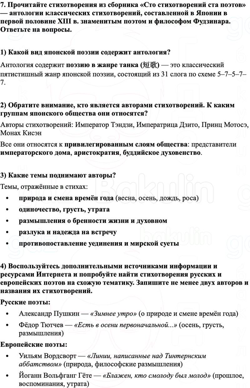 7. Прочитайте стихотворения из сборника «Сто стихотворений ста поэтов» — антологии классических стихотворений, составленной в Японии в первой половине XIII в. знаменитым поэтом и философом Фудзинара. Ответьте на вопросы. 1) Какой вид японской поэзии содержит антология? 2) Обратите внимание, кто является авторами стихотворений. К каким группам японского общества они относятся? 3) Какие темы поднимают авторы? 4) Воспользуйтесь дополнительными источниками информации и ресурсами Интернета и попробуйте найти стихотворения русских и европейских поэтов на схожую тематику. Запишите не менее двух авторов и названия их стихотворений.