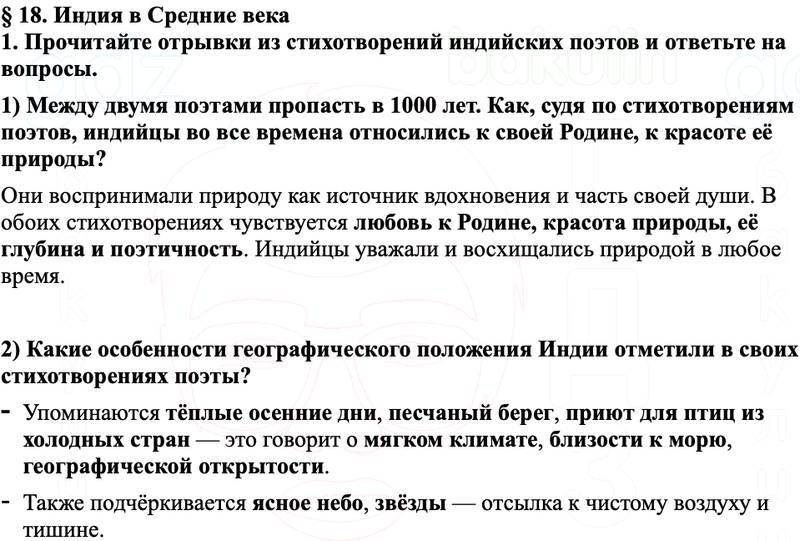 1. Прочитайте отрывки из стихотворений индийских поэтов и ответьте на вопросы. 1) Между двумя поэтами пропасть в 1000 лет. Как, судя по стихотворениям поэтов, индийцы во все времена относились к своей Родине, к красоте её природы? 2) Какие особенности географического положения Индии отметили в своих стихотворениях поэты?