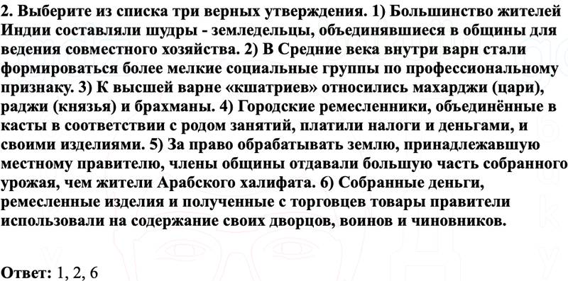 2. Выберите из списка три верных утверждения. 1) Большинство жителей Индии составляли шудры - земледельцы, объединявшиеся в общины для ведения совместного хозяйства. 2) В Средние века внутри варн стали формироваться более мелкие социальные группы по профессиональному признаку. 3) К высшей варне «кшатриев» относились махарджи (цари), раджи (князья) и брахманы. 4) Городские ремесленники, объединённые в касты в соответствии с родом занятий, платили налоги и деньгами, и своими изделиями. 5) За право обрабатывать землю, принадлежавшую местному правителю, члены общины отдавали большую часть собранного урожая, чем жители Арабского халифата. 6) Собранные деньги, ремесленные изделия и полученные с торговцев товары правители использовали на содержание своих дворцов, воинов и чиновников.
