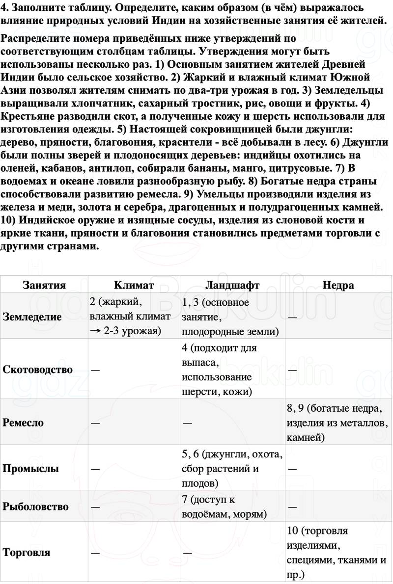 4. Заполните таблицу. Определите, каким образом (в чём) выражалось влияние природных условий Индии на хозяйственные занятия её жителей.