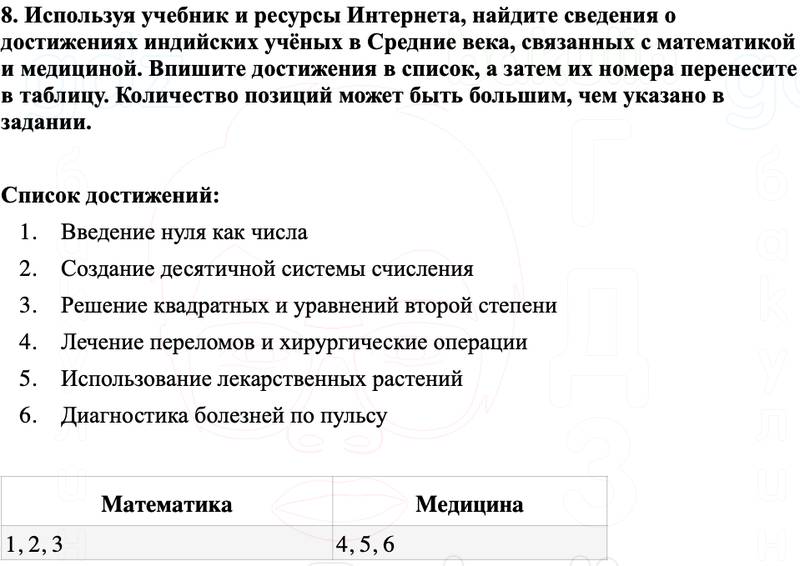8. Используя учебник и ресурсы Интернета, найдите сведения о достижениях индийских учёных в Средние века, связанных с математикой и медициной. Впишите достижения в список, а затем их номера перенесите в таблицу. Количество позиций может быть большим, чем указано в задании.