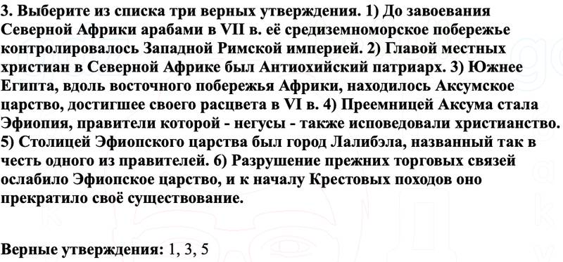 3. Выберите из списка три верных утверждения. 1) До завоевания Северной Африки арабами в VII в. её средиземноморское побережье контролировалось Западной Римской империей. 2) Главой местных христиан в Северной Африке был Антиохийский патриарх. 3) Южнее Египта, вдоль восточного побережья Африки, находилось Аксумское царство, достигшее своего расцвета в VI в. 4) Преемницей Аксума стала Эфиопия, правители которой - негусы - также исповедовали христианство. 5) Столицей Эфиопского царства был город Лалибэла, названный так в честь одного из правителей. 6) Разрушение прежних торговых связей ослабило Эфиопское царство, и к началу Крестовых походов оно прекратило своё существование.