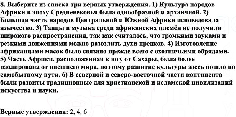 8. Выберите из списка три верных утверждения. 1) Культура народов Африки в эпоху Средневековья была однообразной и архаичной. 2) Большая часть народов Центральной и Южной Африки исповедовала язычество. 3) Танцы и музыка среди африканских племён не получили широкого распространения, так как считалось, что громкими звуками и резкими движениями можно разозлить духи предков. 4) Изготовление африканцами масок было связано прежде всего с охотничьими обрядами. 5) Часть Африки, расположенная к югу от Сахары, была более изолирована от внешнего мира, поэтому развитие культуры здесь пошло по самобытному пути. 6) В северной и северо-восточной части континента были развиты традиционные для христианской и исламской цивилизаций искусства и науки.