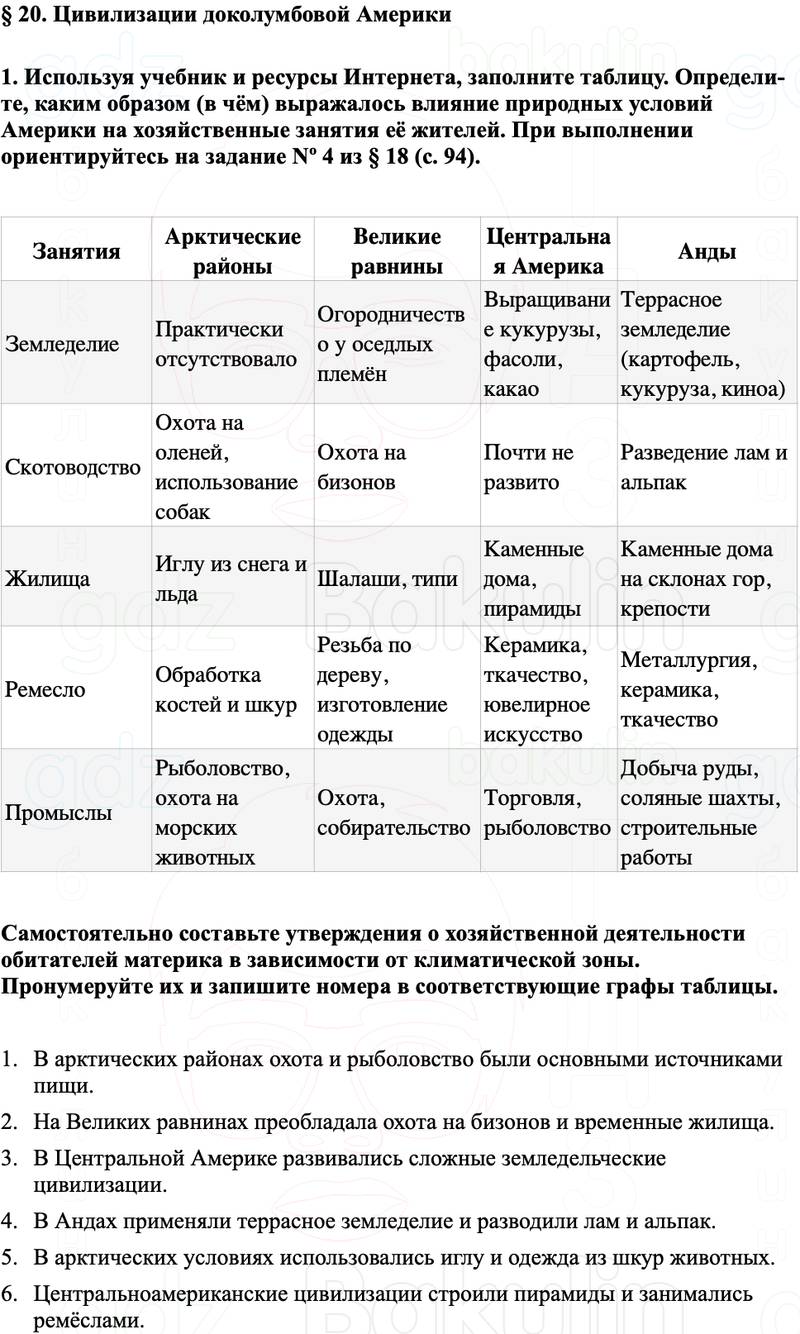 1. Используя учебник и ресурсы Интернета, заполните таблицу. Определи-те, каким образом (в чём) выражалось влияние природных условий Америки на хозяйственные занятия её жителей. При выполнении ориентируйтесь на задание Nº 4 из § 18 (с. 94). Самостоятельно составьте утверждения о хозяйственной деятельности обитателей материка в зависимости от климатической зоны. Пронумеруйте их и запишите номера в соответствующие графы таблицы.