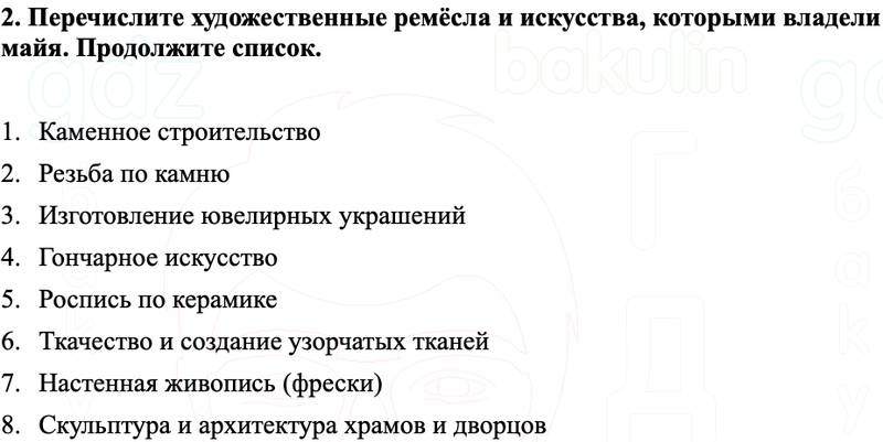 2. Перечислите художественные ремёсла и искусства, которыми владели майя. Продолжите список.