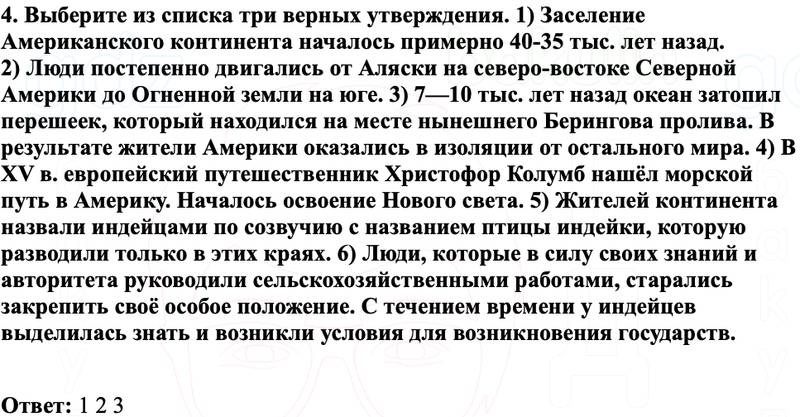 4. Выберите из списка три верных утверждения. 1) Заселение Американского континента началось примерно 40-35 тыс. лет назад. 2) Люди постепенно двигались от Аляски на северо-востоке Северной Америки до Огненной земли на юге. 3) 7—10 тыс. лет назад океан затопил перешеек, который находился на месте нынешнего Берингова пролива. В результате жители Америки оказались в изоляции от остального мира. 4) В XV в. европейский путешественник Христофор Колумб нашёл морской путь в Америку. Началось освоение Нового света. 5) Жителей континента назвали индейцами по созвучию с названием птицы индейки, которую разводили только в этих краях. 6) Люди, которые в силу своих знаний и авторитета руководили сельскохозяйственными работами, старались закрепить своё особое положение. С течением времени у индейцев выделилась знать и возникли условия для возникновения государств.