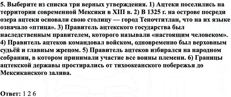 5. Выберите из списка три верных утверждения. 1) Ацтеки поселились на территории современной Мексики в XIII в. 2) В 1325 г. на острове посреди озера ацтеки основали свою столицу — город Теночтитлан, что на их языке означало «птица». 3) Правитель ацтекского государства был наследственным правителем, которого называли «настоящим человеком». 4) Правитель ацтеков командовал войском, одновременно был верховным судьёй и главным жрецом. 5) Правитель ацтеков избирался на народном собрании, в котором принимали участие все воины племени. 6) Границы ацтекской державы простирались от тихоокеанского побережья до Мексиканского залива.