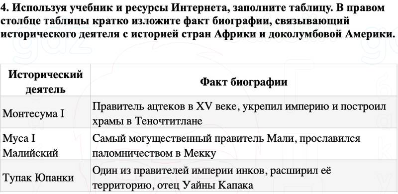 4. Используя учебник и ресурсы Интернета, заполните таблицу. В правом столбце таблицы кратко изложите факт биографии, связывающий исторического деятеля с историей стран Африки и доколумбовой Америки.