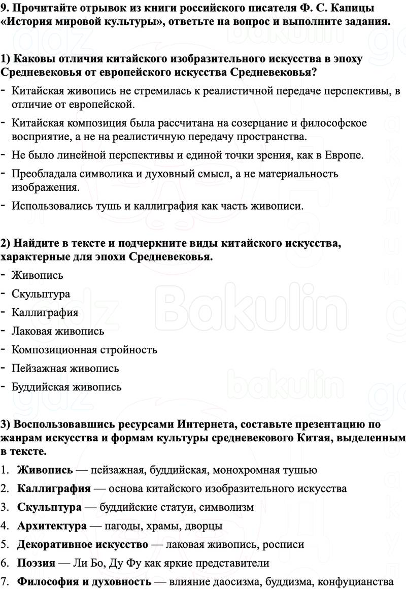 9. Прочитайте отрывок из книги российского писателя Ф. С. Капицы «История мировой культуры», ответьте на вопрос и выполните задания. 1) Каковы отличия китайского изобразительного искусства в эпоху Средневековья от европейского искусства Средневековья? 2) Найдите в тексте и подчеркните виды китайского искусства, характерные для эпохи Средневековья. 3) Воспользовавшись ресурсами Интернета, составьте презентацию по жанрам искусства и формам культуры средневекового Китая, выделенным в тексте.