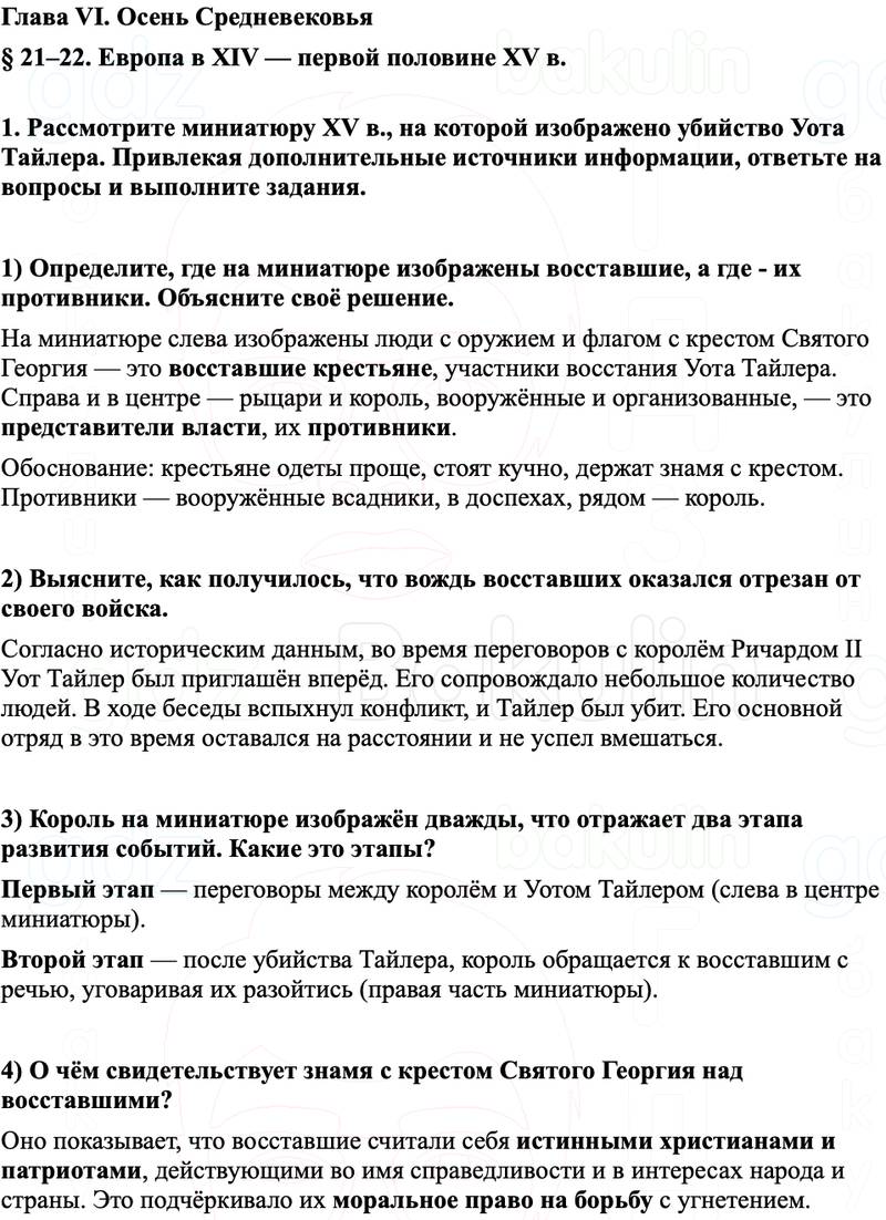 1. Рассмотрите миниатюру XV в., на которой изображено убийство Уота Тайлера. Привлекая дополнительные источники информации, ответьте на вопросы и выполните задания. 1) Определите, где на миниатюре изображены восставшие, а где - их противники. Объясните своё решение. 2) Выясните, как получилось, что вождь восставших оказался отрезан от своего войска. 3) Король на миниатюре изображён дважды, что отражает два этапа развития событий. Какие это этапы? 4) О чём свидетельствует знамя с крестом Святого Георгия над восставшими?