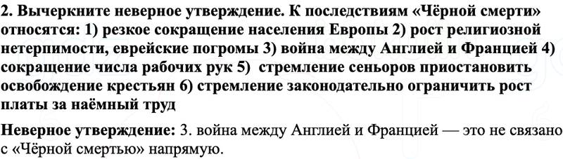 2. Вычеркните неверное утверждение. К последствиям «Чёрной смерти» относятся: 1) резкое сокращение населения Европы 2) рост религиозной нетерпимости, еврейские погромы 3) война между Англией и Францией 4) сокращение числа рабочих рук 5) стремление сеньоров приостановить освобождение крестьян 6) стремление законодательно ограничить рост платы за наёмный труд