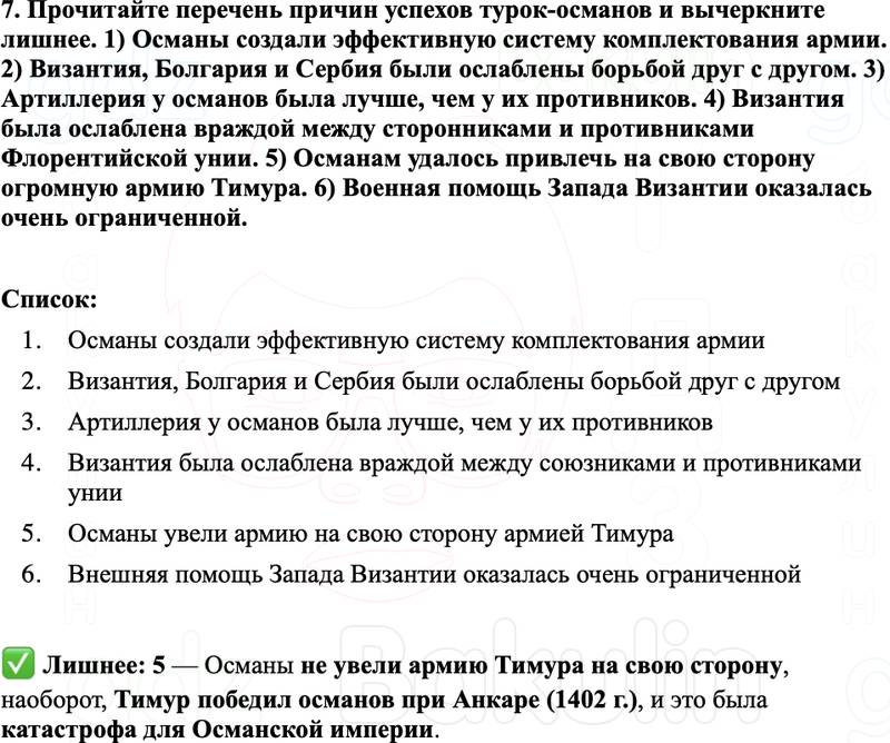 7. Прочитайте перечень причин успехов турок-османов и вычеркните лишнее. 1) Османы создали эффективную систему комплектования армии. 2) Византия, Болгария и Сербия были ослаблены борьбой друг с другом. 3) Артиллерия у османов была лучше, чем у их противников. 4) Византия была ослаблена враждой между сторонниками и противниками Флорентийской унии. 5) Османам удалось привлечь на свою сторону огромную армию Тимура. 6) Военная помощь Запада Византии оказалась очень ограниченной.