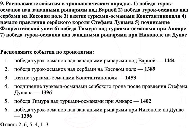 9. Расположите события в хронологическом порядке. 1) победа турок-османов над западными рыцарями под Варной 2) победа турок-османов над сербами на Косовом поле 3) взятие турками-османами Константинополя 4) начало правления сербского короля Стефана Душана 5) подписание Флорентийской унии 6) победа Тимура над турками-османами при Анкаре 7) победа турок-османов над западными рыцарями при Никополе на Дунае