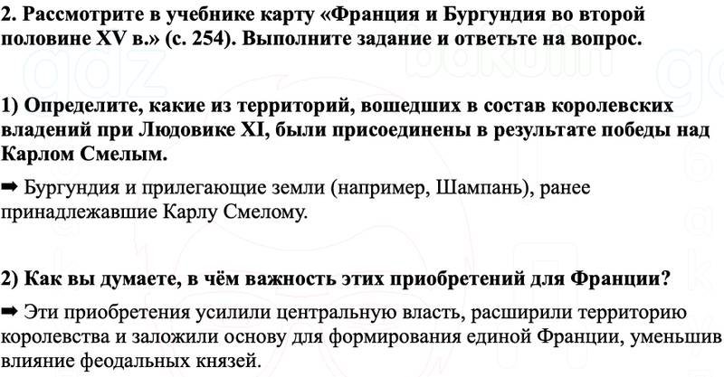 2. Рассмотрите в учебнике карту «Франция и Бургундия во второй половине XV в.» (с. 254). Выполните задание и ответьте на вопрос. 1) Определите, какие из территорий, вошедших в состав королевских владений при Людовике XI, были присоединены в результате победы над Карлом Смелым. 2) Как вы думаете, в чём важность этих приобретений для Франции?