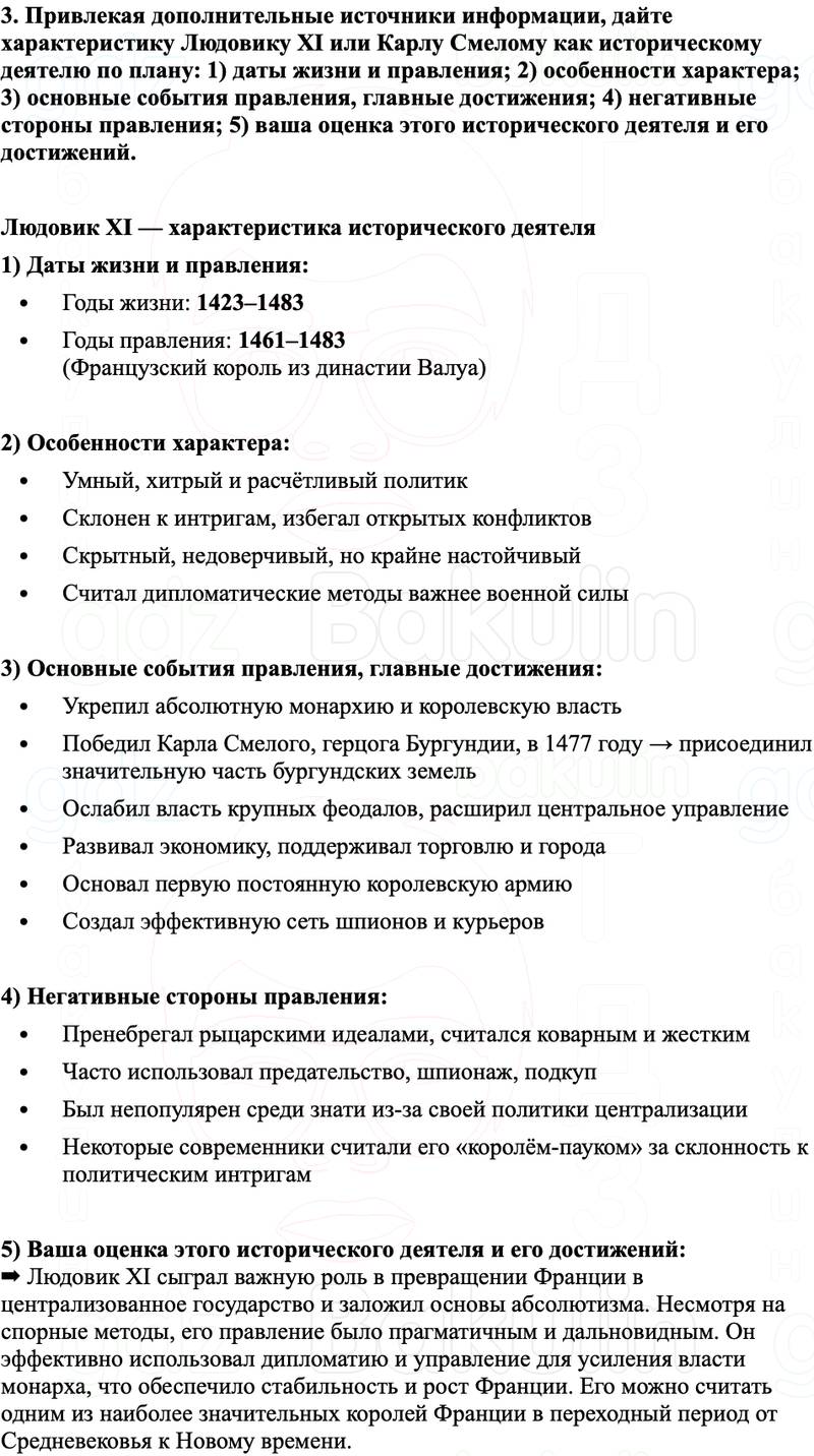 3. Привлекая дополнительные источники информации, дайте характеристику Людовику XI или Карлу Смелому как историческому деятелю по плану: 1) даты жизни и правления; 2) особенности характера; 3) основные события правления, главные достижения; 4) негативные стороны правления; 5) ваша оценка этого исторического деятеля и его достижений.