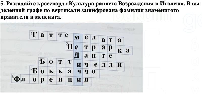 5. Разгадайте кроссворд «Культура раннего Возрождения в Италии». В вы-деленной графе по вертикали зашифрована фамилия знаменитого правителя и мецената.