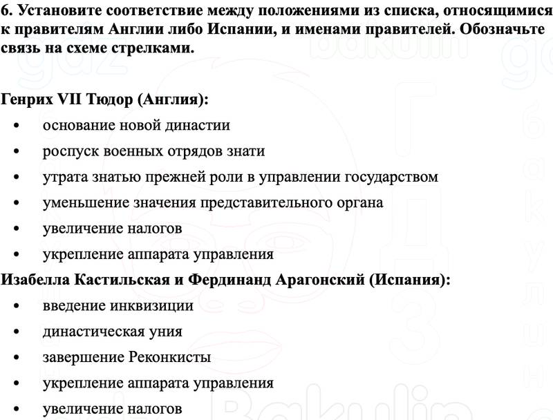 6. Установите соответствие между положениями из списка, относящимися к правителям Англии либо Испании, и именами правителей. Обозначьте связь на схеме стрелками.