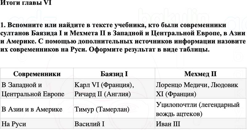 1. Вспомните или найдите в тексте учебника, кто были современники султанов Баязида І и Мехмета ІІ в Западной и Центральной Европе, в Азии и Америке. С помощью дополнительных источников информации назовите их современников на Руси. Оформите результат в виде таблицы.