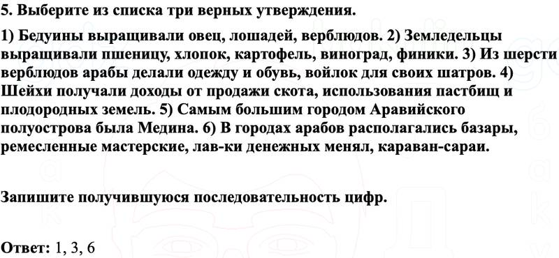 1) Бедуины выращивали овец, лошадей, верблюдов. 2) Земледельцы выращивали пшеницу, хлопок, картофель, виноград, финики. 3) Из шерсти верблюдов арабы делали одежду и обувь, войлок для своих шатров. 4) Шейхи получали доходы от продажи скота, использования пастбищ и плодородных земель. 5) Самым большим городом Аравийского полуострова была Медина. 6) В городах арабов располагались базары, ремесленные мастерские, лав-ки денежных менял, караван-сараи.