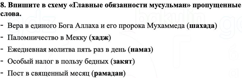 8. Впишите в схему «Главные обязанности мусульман» пропущенные слова.
