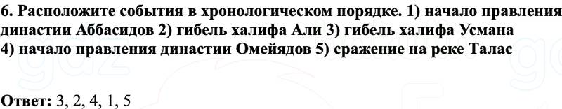 6. Расположите события в хронологическом порядке. 1) начало правления династии Аббасидов 2) гибель халифа Али 3) гибель халифа Усмана 4) начало правления династии Омейядов 5) сражение на реке Талас