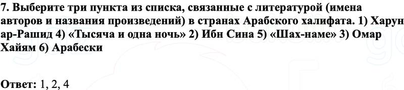 7. Выберите три пункта из списка, связанные с литературой (имена авторов и названия произведений) в странах Арабского халифата. 1) Харун ар-Рашид 4) «Тысяча и одна ночь» 2) Ибн Сина 5) «Шах-наме» 3) Омар Хайям 6) Арабески