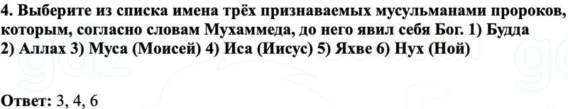 4. Выберите из списка имена трёх признаваемых мусульманами пророков, которым, согласно словам Мухаммеда, до него явил себя Бог. 1) Будда 2) Аллах 3) Муса (Моисей) 4) Иса (Иисус) 5) Яхве 6) Нух (Ной)