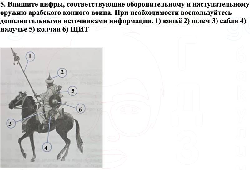 5. Впишите цифры, соответствующие оборонительному и наступательному оружию арабского конного воина. При необходимости воспользуйтесь дополнительными источниками информации. 1) копьё 2) шлем 3) сабля 4) налучье 5) колчан 6) ЩИТ