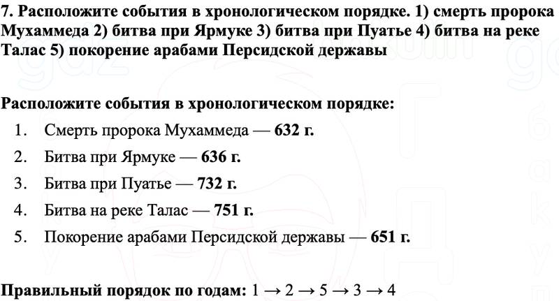 7. Расположите события в хронологическом порядке. 1) смерть пророка Мухаммеда 2) битва при Ярмуке 3) битва при Пуатье 4) битва на реке Талас 5) покорение арабами Персидской державы