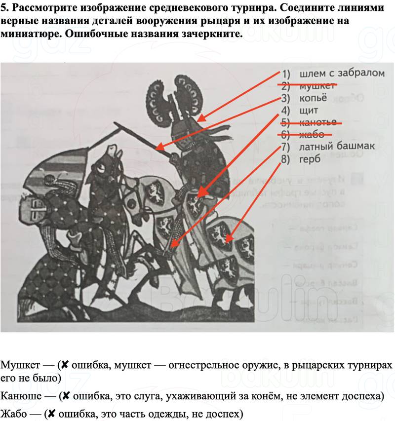 5. Рассмотрите изображение средневекового турнира. Соедините линиями верные названия деталей вооружения рыцаря и их изображение на миниатюре. Ошибочные названия зачеркните.