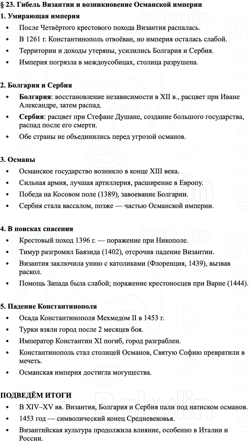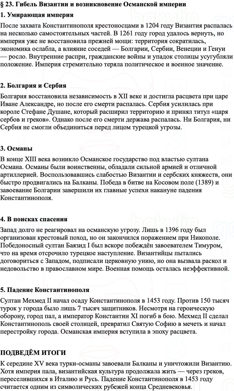 Краткое содержание и пересказ Параграф 23 Гибель Византии и возникновение Османской империи
