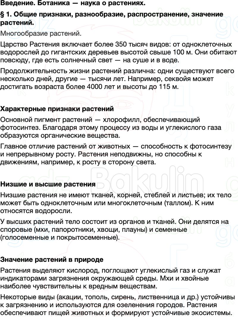 Краткое содержание пересказ Параграф 1 Общие признаки, разнообразие, распространение, значение растений