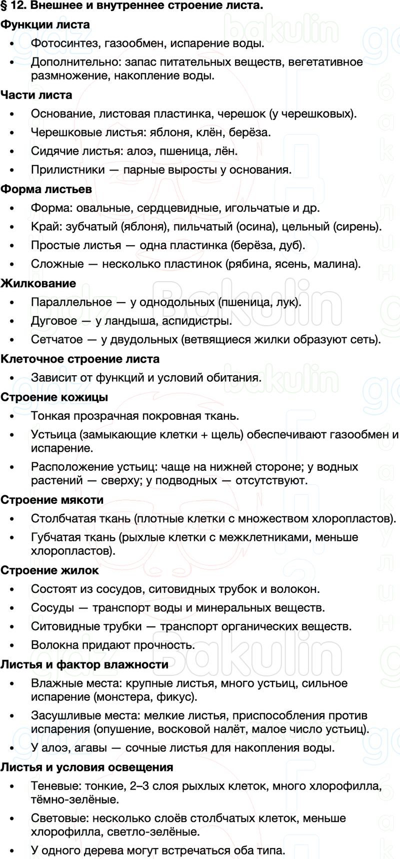 Краткое содержание пересказ Параграф 12 Внешнее и внутреннее строение листа
