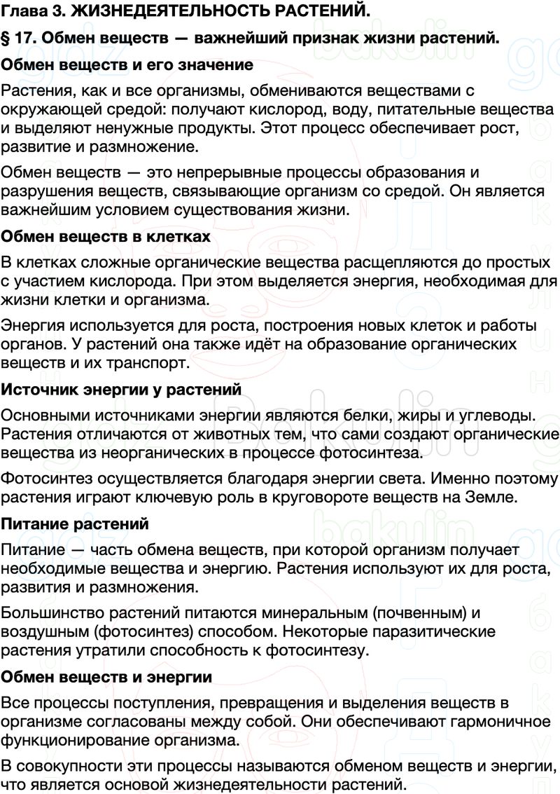 Краткое содержание пересказ Параграф 17 Обмен веществ — важнейший признак жизни растений