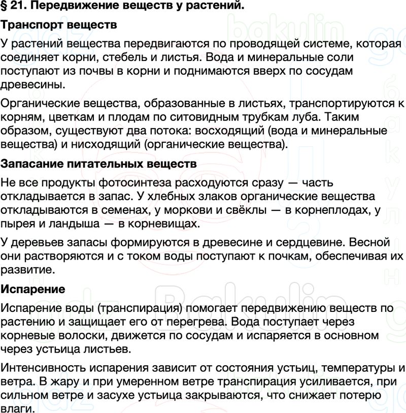 Краткое содержание пересказ Параграф 21 Передвижение веществ у растений