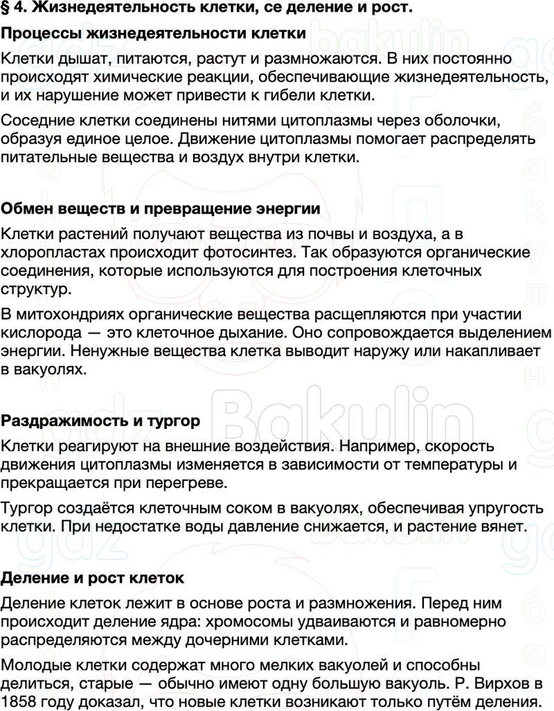 Краткое содержание пересказ Параграф 4 Жизнедеятельность клетки, се деление и рост