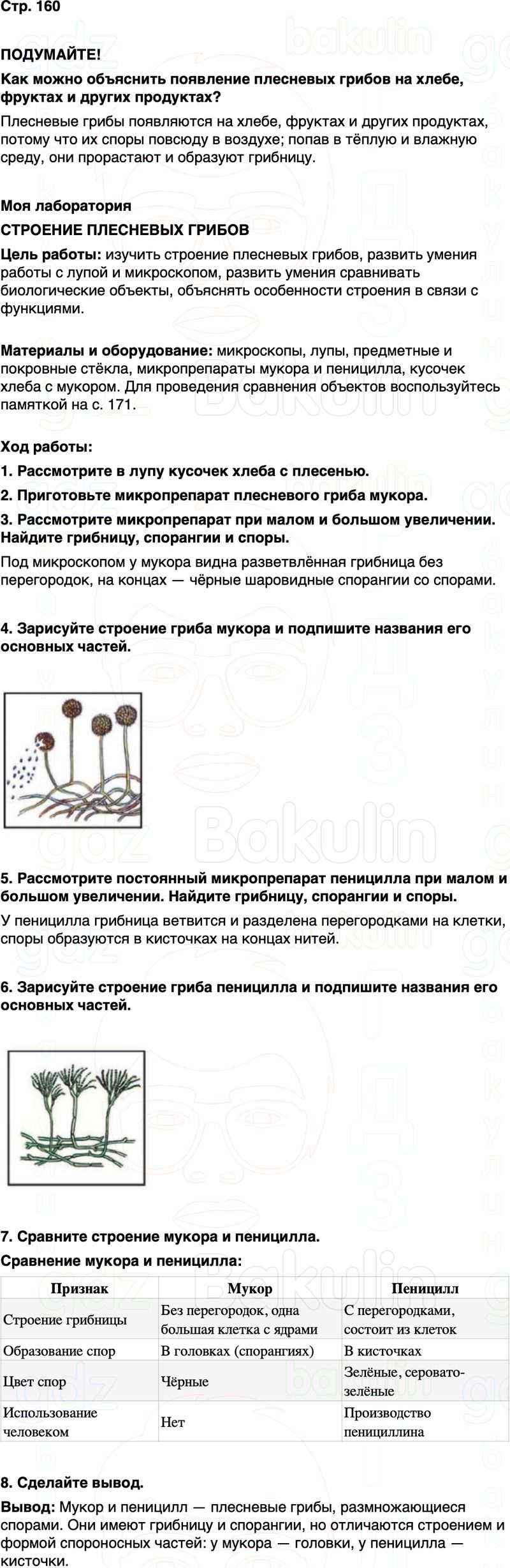 Материалы и оборудование: микроскопы, лупы, предметные и покровные стёкла, микропрепараты мукора и пеницилла, кусочек хлеба с мукором. Для проведения сравнения объектов воспользуйтесь памяткой на с. 171.