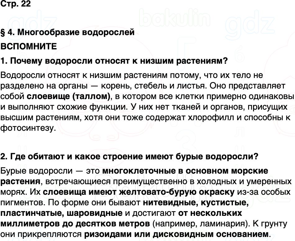§ 4. Многообразие водорослей ВСПОМНИТЕ 1. Почему водоросли относят к низшим растениям? 2. Где обитают и какое строение имеют бурые водоросли?