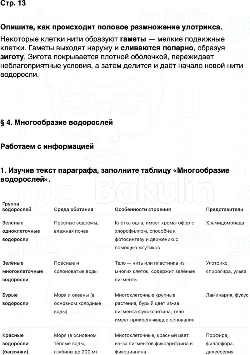 1. Изучив текст параграфа, заполните таблицу «Многообразие водорослей».