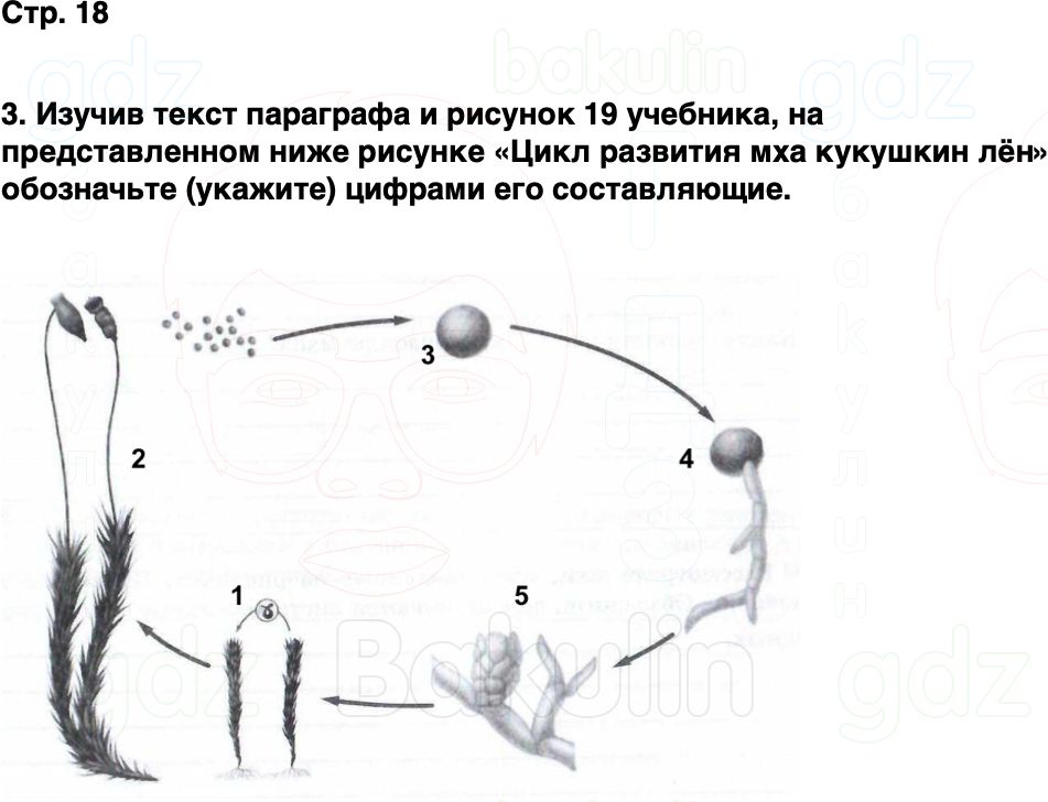 3. Изучив текст параграфа и рисунок 19 учебника, на представленном ниже рисунке «Цикл развития мха кукушкин лён» обозначьте (укажите) цифрами его составляющие.