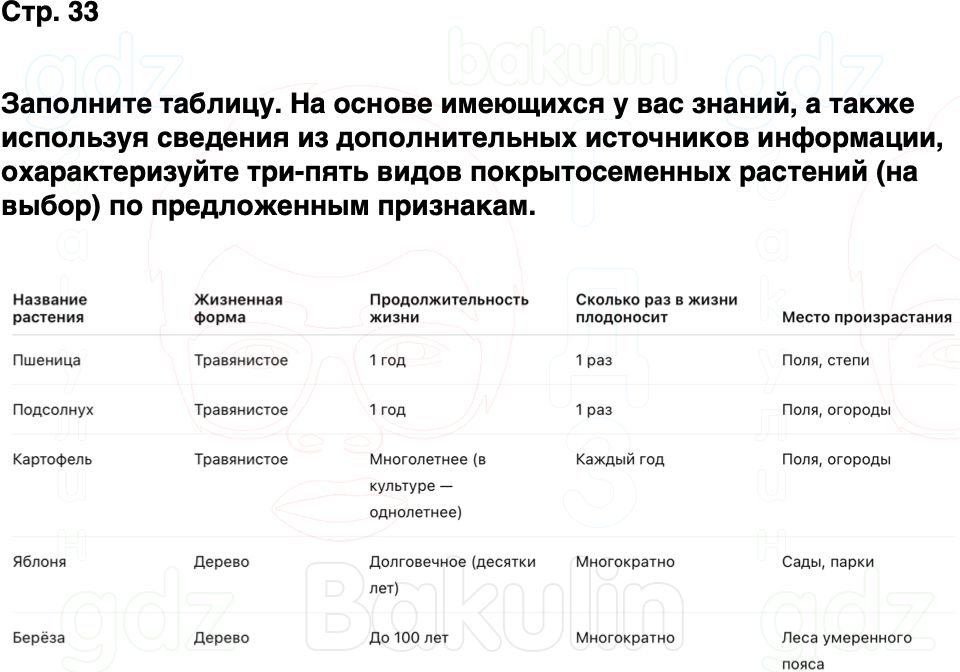 Заполните таблицу. На основе имеющихся у вас знаний, а также используя сведения из дополнительных источников информации, охарактеризуйте три-пять видов покрытосеменных растений (на выбор) по предложенным признакам.