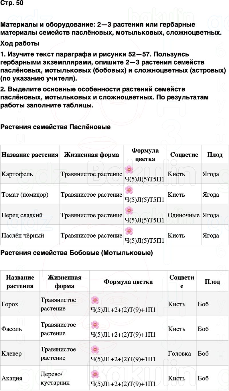 Материалы и оборудование: 2—3 растения или гербарные материалы семейств паслёновых, мотыльковых, сложноцветных.