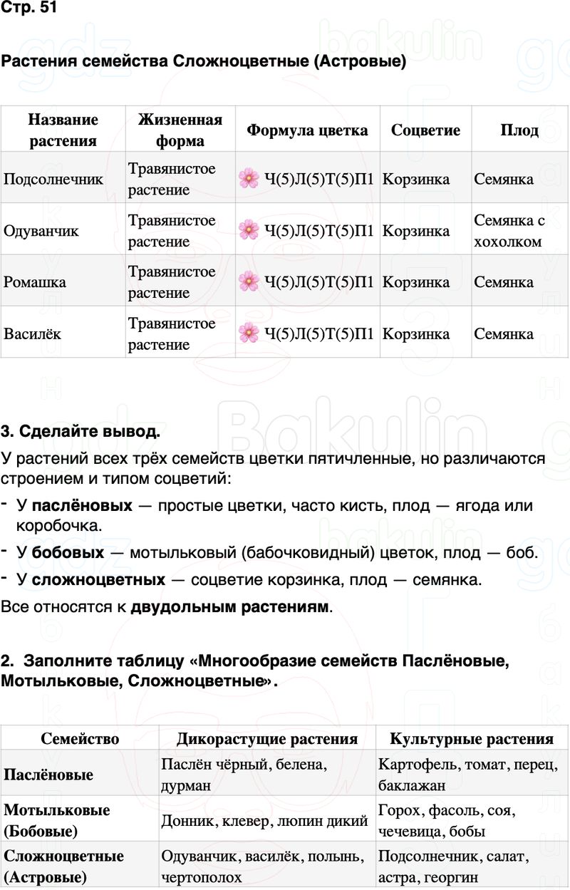 2. Заполните таблицу «Многообразие семейств Паслёновые, Мотыльковые, Сложноцветные».