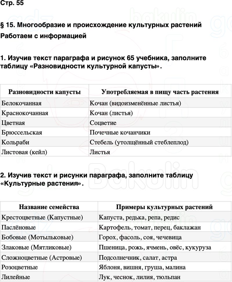 1. Изучив текст параграфа и рисунок 65 учебника, заполните таблицу «Разновидности культурной капусты».