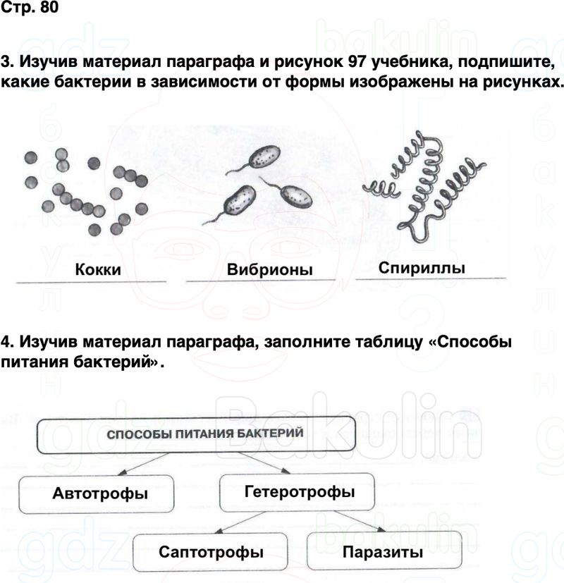 3. Изучив материал параграфа и рисунок 97 учебника, подпишите, какие бактерии в зависимости от формы изображены на рисунках.
