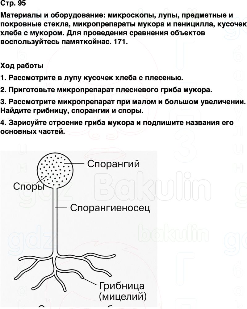 Материалы и оборудование: микроскопы, лупы, предметные и покровные стекла, микропрепараты мукора и пеницилла, кусочек хлеба с мукором. Для проведения сравнения объектов воспользуйтесь памяткойнас. 171.