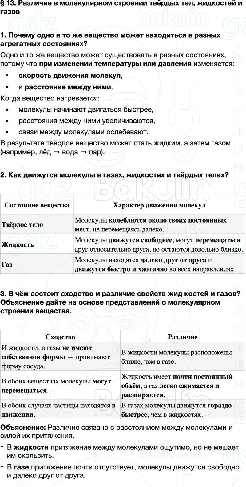 § 13. Различие в молекулярном строении твёрдых тел, жидкостей и газов