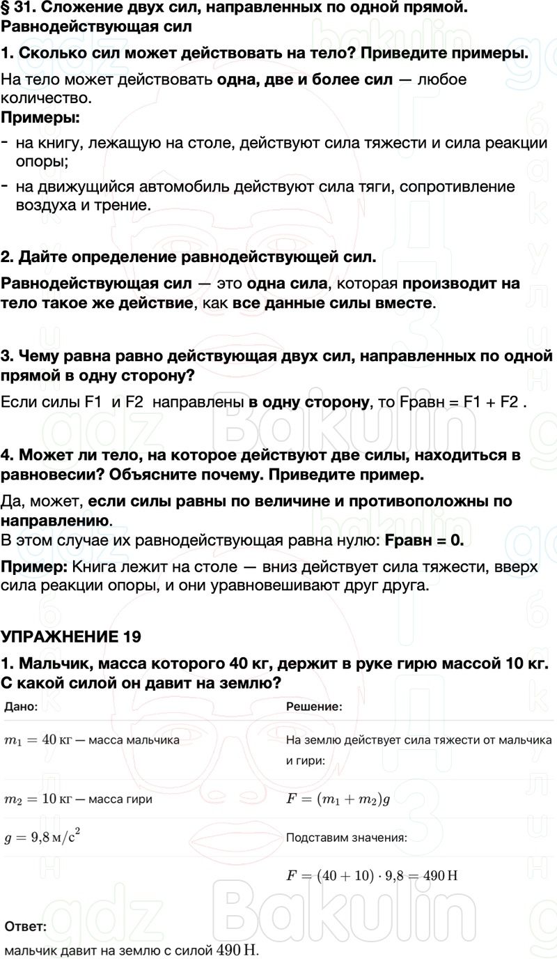 1. Мальчик, масса которого 40 кг, держит в руке гирю массой 10 кг. С какой силой он давит на землю?