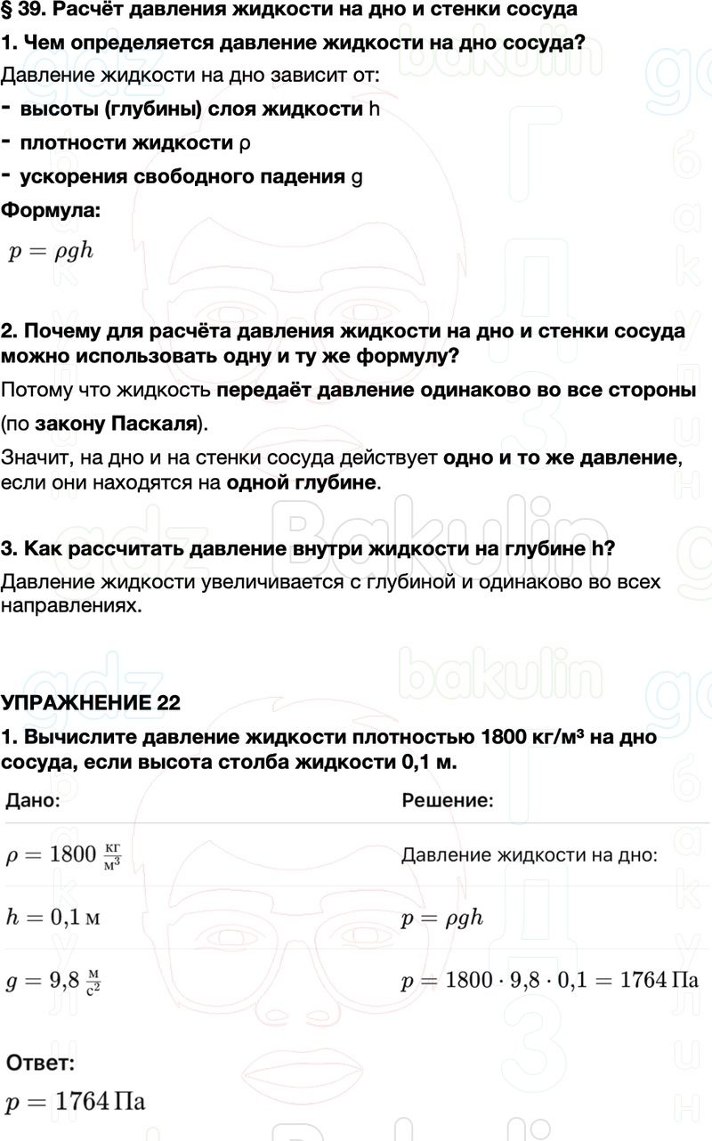 § 39. Расчёт давления жидкости на дно и стенки сосуда